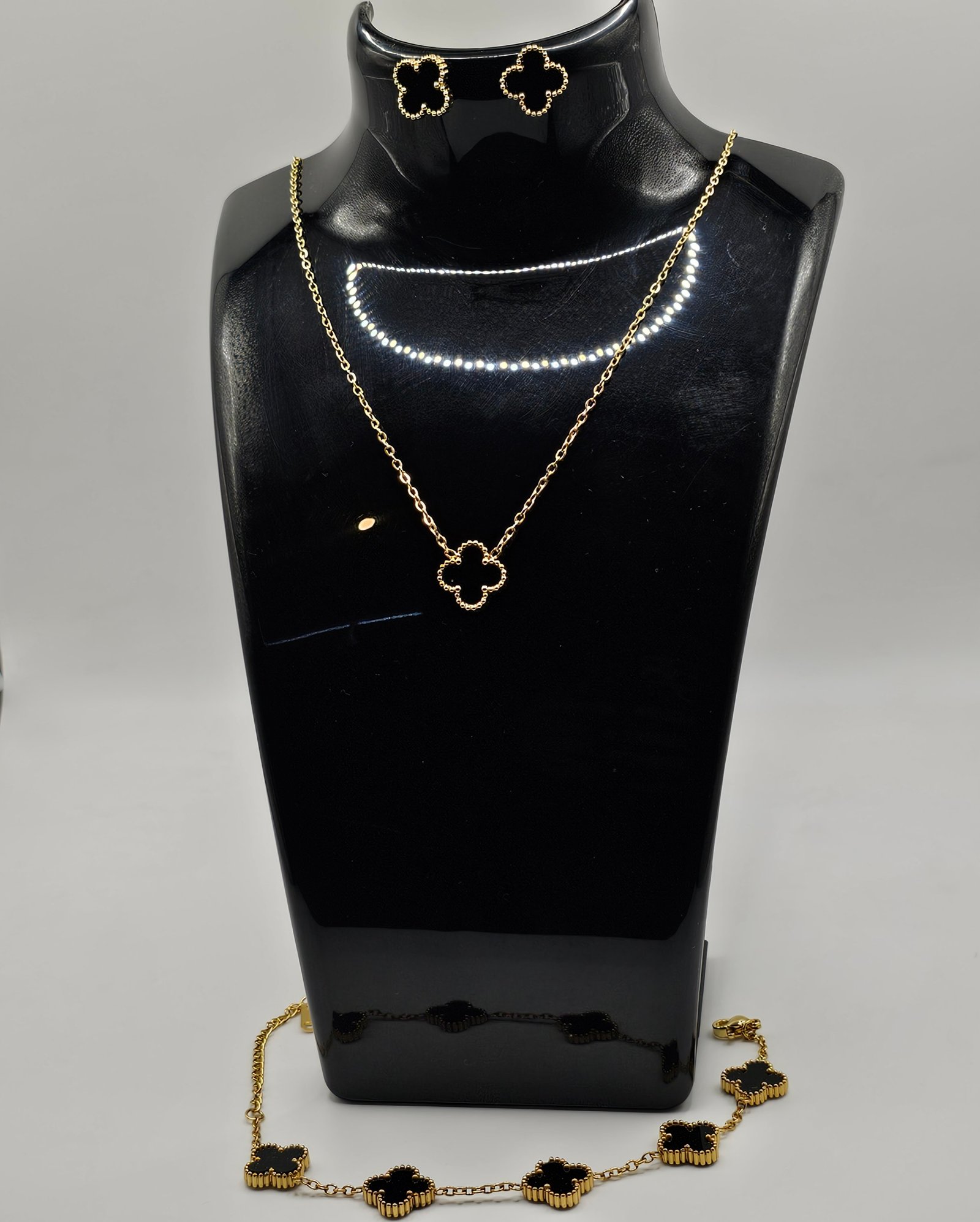 Conjunto de aretes, collar y pulsera tipo Van Cleef, acero inoxidable